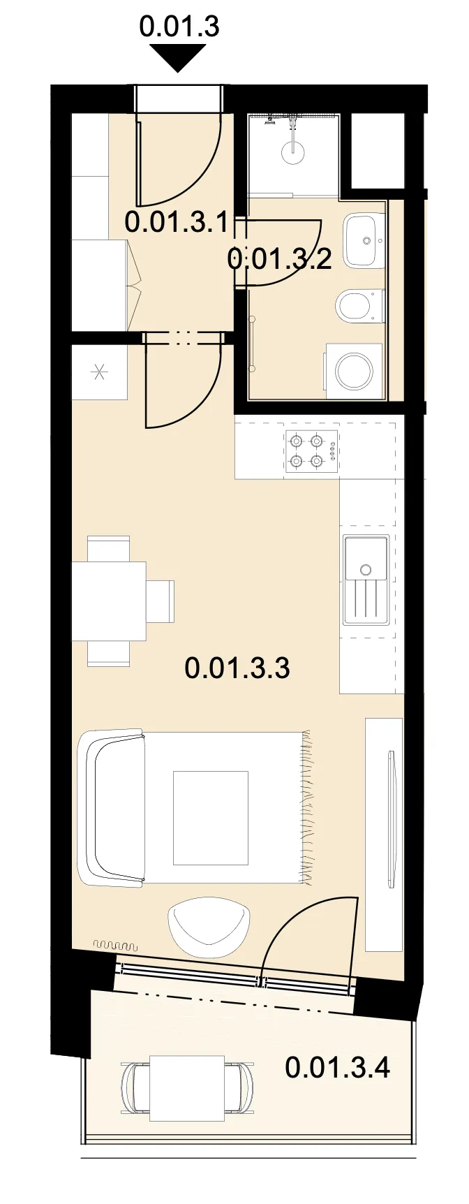 | 03 | Obývací pokoj + KK | 22,7 m2 |
