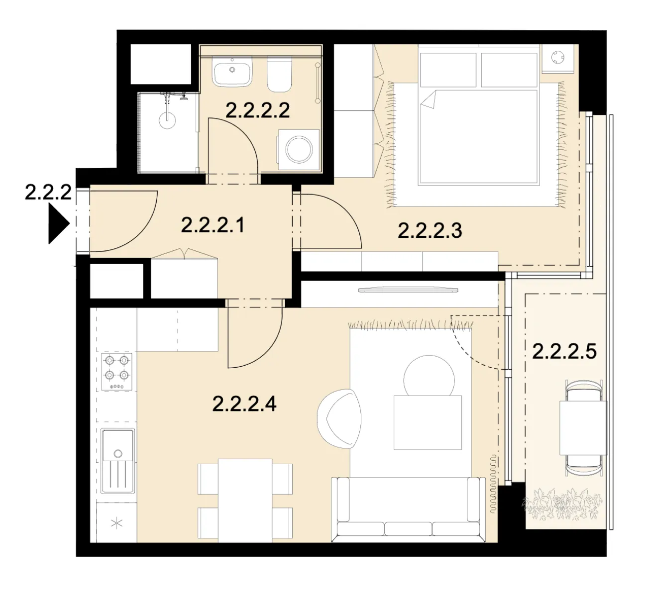 | 04 | Obývací pokoj + KK | 22,6 m2 |