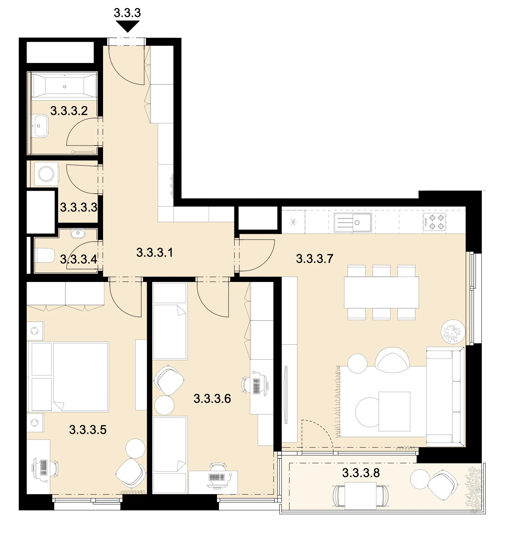| 07 | Obývací pokoj + KK | 30,7 m2 |